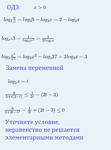 Решите неравенство: 9/(3+ log3x *log3 9/x) ≤ logx^2 3 - log3 x^2/27