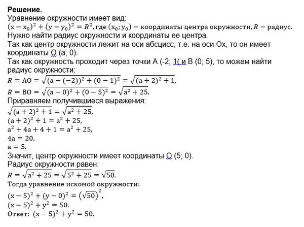 НАПИСАТЬ УРАВНЕНИЕ ОКРУЖНОСТИ ПРОХОДЯЩЕЙ ЧЕРЕЗ ТОЧКУ А (-2;1) И b (0 ;5)ЦЕНТР ОКРУЖНОСТИ лежит на оси абцисс