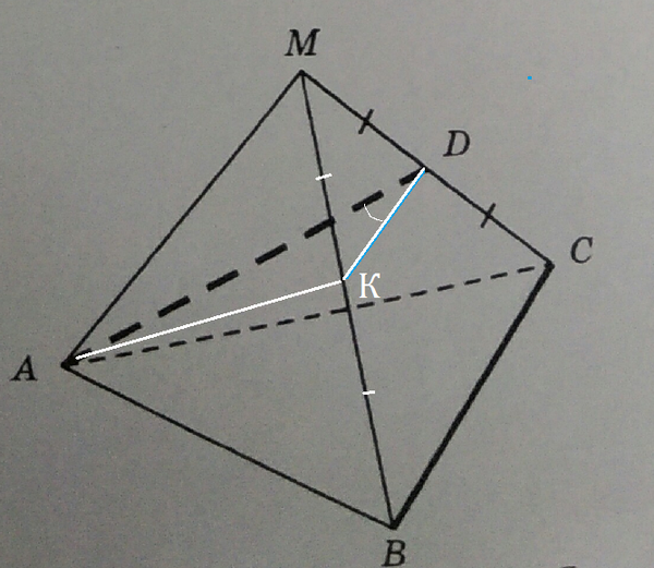 cos ∠ ADK=(AD^2+DK^2-AK^2)/2AD*DK=DK/2AD=(a/2)/(a*sqrt(3)=sqrt(3)/6