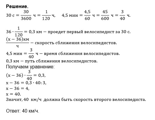 Первый велосипедист стартует со скоростью 36 км/ч. Через 30 с вслед за ним стартует второй велосипедист со скоростью х км/ч. При каком значении х второй велосипедист догонит первого через 4,5 мин?