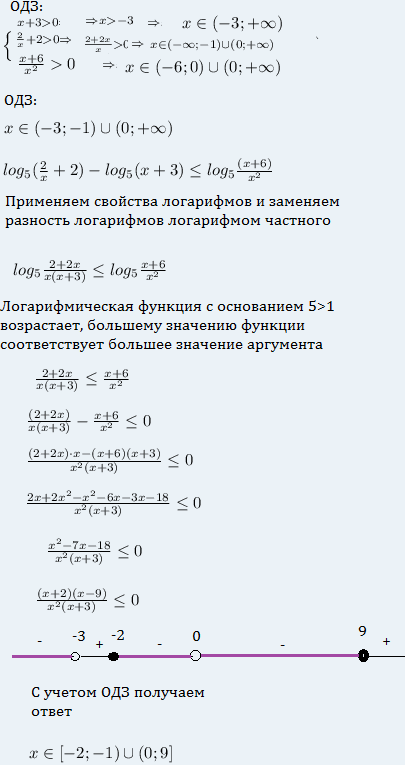 Решить неравенство log5((2/x)+2)-log5(x+3) ≤ log5((x+6)/x^2)