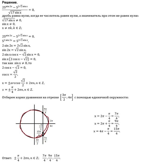 а) Решите уравнение (25^(sin2x)-5^(2sqrt(2)sinx))/sqrt(17sinx) = 0. б) Найдите все корни этого уравнения, принадлежащие отрезку [3Pi/2; 4Pi]