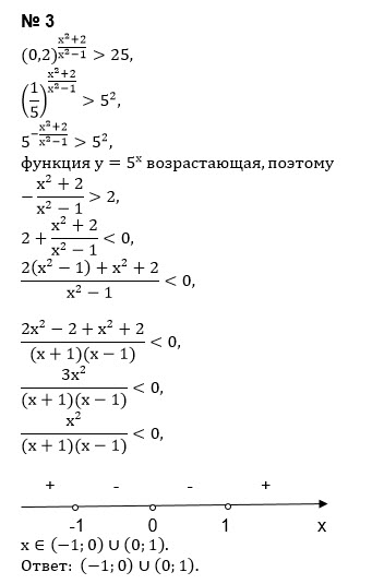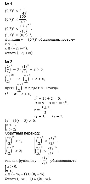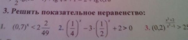 3. Решить показательное неравенство: 1. (0.7)^x < 2 (2/49) 2. (1/4)^x - 3*(1/2)^x + 2 > 0 3. (0.2)^ -x^2 + 2 / x^2 -1 > 25