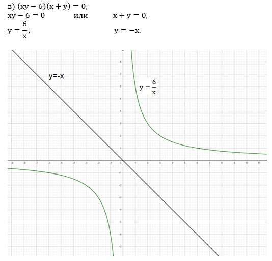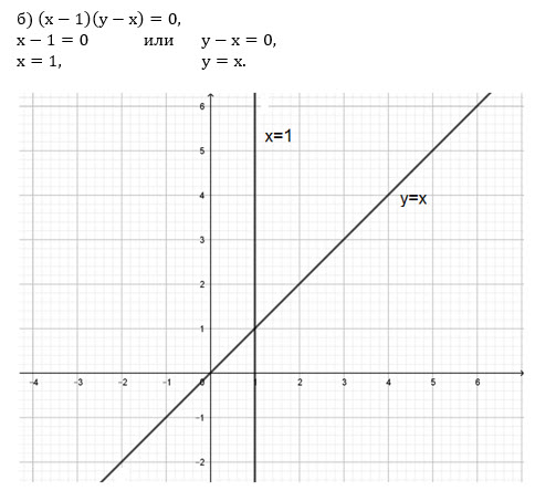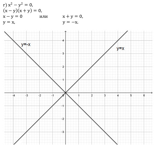 Постройте график уравнения: а) (x-4)(y-3)=0; б) (x-1)(y-x)=0; в) (xy-6)(x+y)=0; г) (x^2-y^2)=0.