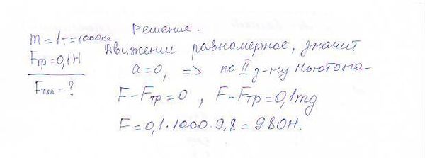 на автомобиль массой 1 т во время движения действует сила трения скольжения f тр, равная 0,1 от веса тела. какова должна быть сила тяги f, развиваемая мотором автомобиля, чтобы автомобиль двигался равномерно.