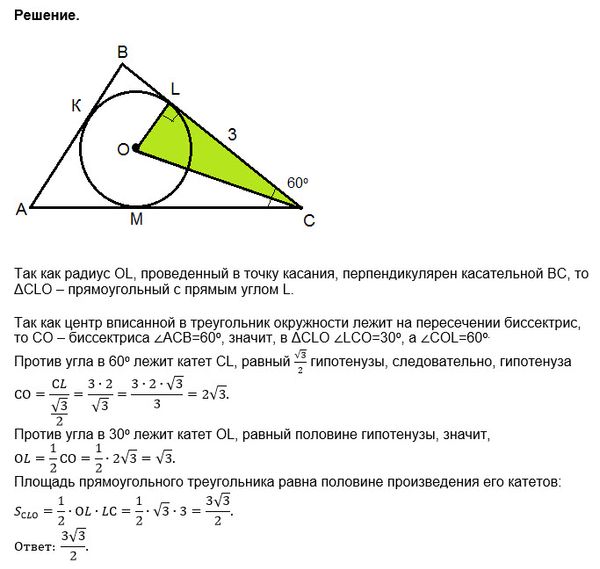в треугольник АВС вписана окружность с центром вточке О ,касающаяся сторон АВ ВС иАС соответственно в точках К L M известно что CL=3,уголАСВ равен 60 градусам.Найти площадь тр. СLO