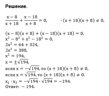 Реши уравнение x−8/x+18+x−18/x+8=0. В ответе запиши произведение корней уравнения. (При необходимости ответ округли до сотых, при решении вычислять приближенное значение корней не нужно, при умножении воспользуйся свойством корня!) Ответ: .