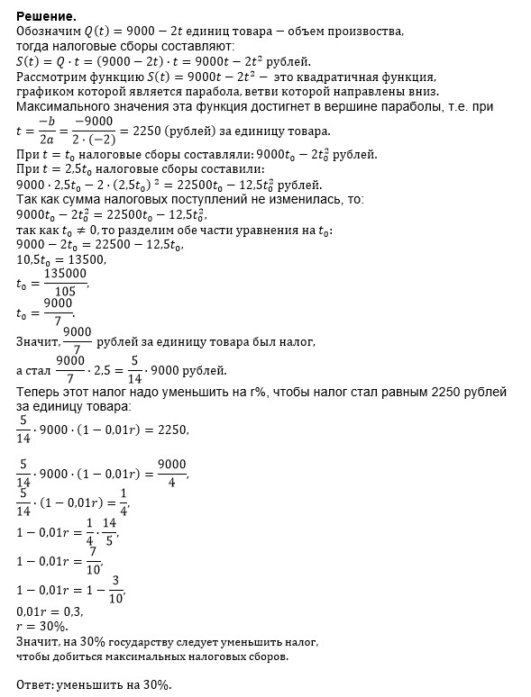 производство некоторого товара облагалось налогом в размере t0 руб. за ед. товара. государство увеличило налог в 2.5 раза(t1= 2.5t0),но сумма налоговых поступлений не изменилась. на сколько процентов государству следует изменить налог, чтобы добиться максимальных налоговых сборов. если известно, что при налоге=t руб.за ед. товара, обьем производства товара составляет 9000-2t ед., если это число >0, и 0 единиц иначе.