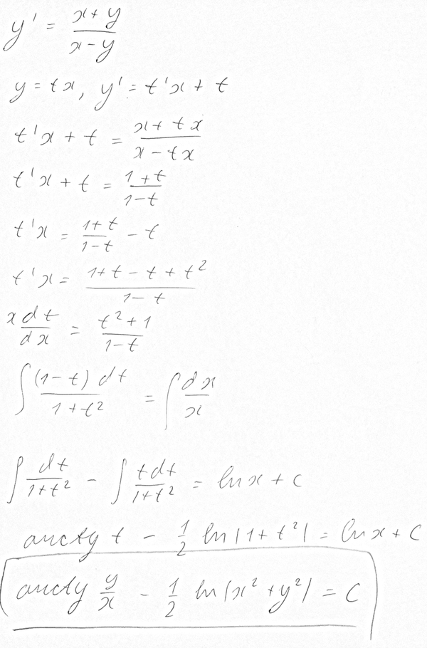 y'=(x+y)/(x-y) решить дифференциальное уравнение