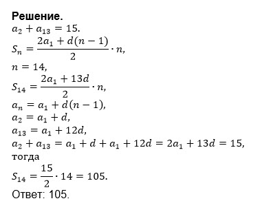 Сумма второго и тринадцатого членов арифметической прогрессии равна 15. Чему равна сумма первых 14 членов данной прогрессии?