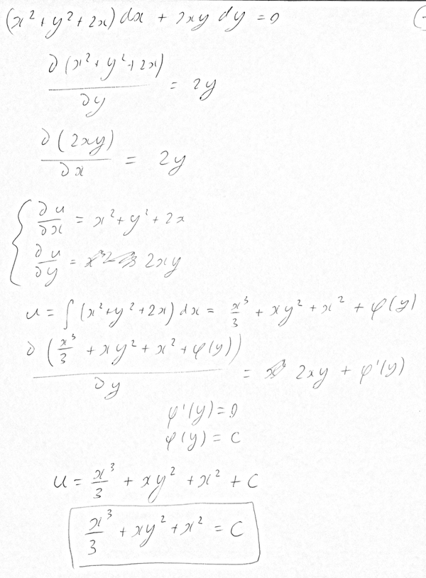 (x^2 + y^2 + 2x)dx + 2xydy = 0 решить дифференциальное уравнение