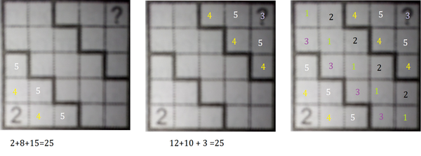 В клетки квадрата на рисунке Вася хочет вписать числа от 1 до 5 так, чтобы в каждом столбце все числа были различны. Квадрат разбит на три области. Суммы чисел в областях должны быть равны. В левую нижнюю клетку Вася вписал число 2. Какое число он впишет в правую верхнюю клетку?