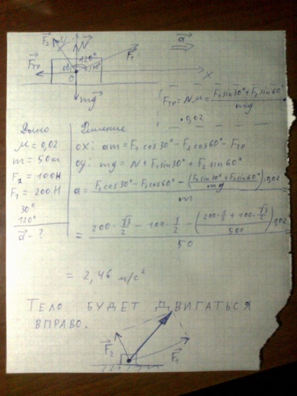 на тело массой 50 кг действуют две силы 200 Н и 100 Н под углами 30 и 120 градусов. В каком направлении и с каким ускорением будет двигаться тело, если коэфициент трения 0.02