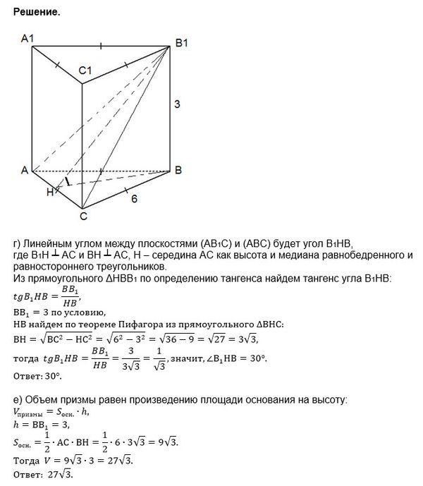 В правильной треугольной призма АВСА1В1С1 сторона основания равна 6 см , а боковое ребро равно 3 см . г) Найдите угол между плоскостями АВ1С и АВС е) Найдите объём призмы