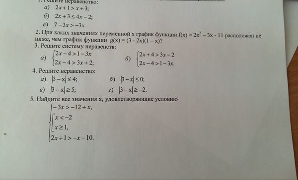 2. При каких значениях переменной x график функции [m]f(x) = 2x^2 - 3x - 11[/m] расположен не ниже, чем график функции [m] g(x) = (3 - 2x)(1 - x)?[/m]