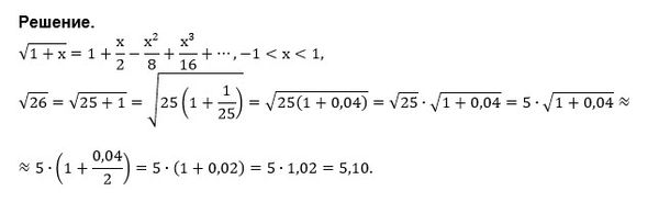 Вычисление будет тем точнее, чем меньше число х. (Если исходное число большое, то его предварительно преобразуют в произведение квадрата числа, меньшего данного, на число, чуть большее или меньшее единицы.) Используя приведённую формулу, вычислите √26 с точностью до сотых.