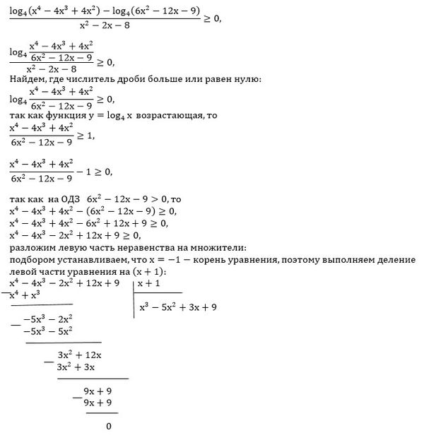 [block] (log4(x^4-4x^3+4x^2)-log4(6x^2-12x-9))/(x^2-2x-8) ≥ 0 [/block]