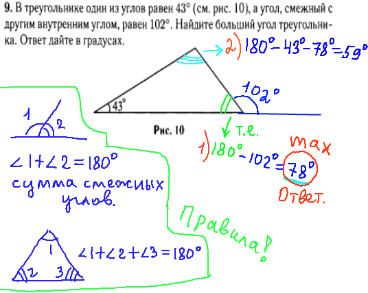 В треугольнике один из углов равен 43 градуса, а угол, смежный с другим внутренним углом, равен 102 градуса. Найдите больший угол треугольника. Ответ дайте в градусах