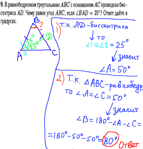 В равнобедренном треугольнике ABC с основанием AC проведена биссектриса AD. Чему равен угол ABC, если угол BAD = 25 градусов? Ответ дайте в градусах.