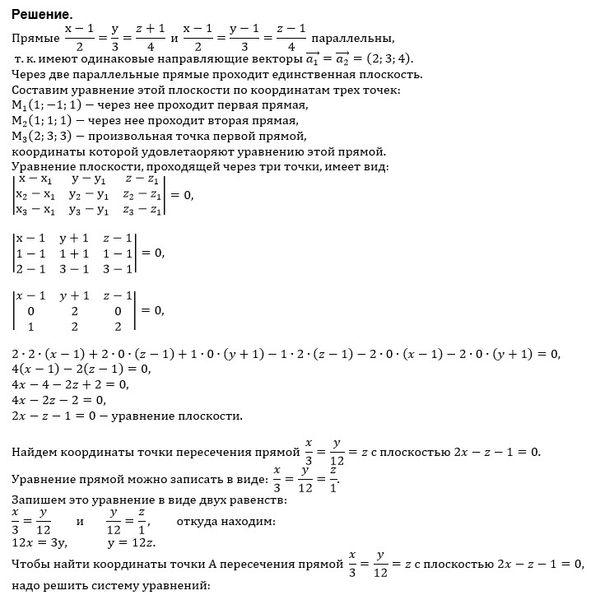 Найдите координаты точки пересечения прямой х/3 = у/12 = z с плоскостью, содержащей прямые (х-1)/2 =у/3=(z+1)/4 и (х-1)/2 = (у-1)/3 = (z-1)/4 .