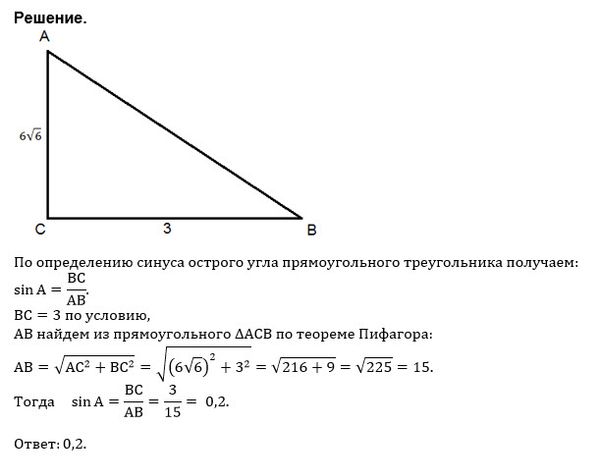 В треугольнике ABC угол C равен 90°, AC=6√6, BC=3. Найдите sinA.