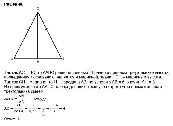 В треугольнике ABC AC=BC, AB=6, cos A=0,75. Найдите AC.