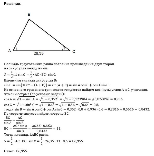 В треугольнике АВС длина стороны АС равна 26,35 и синусы острых углов ВАС и ВСА равны соответственно 0,352 и 0,6. Найти площадь треугольника.