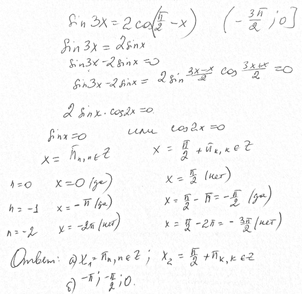 3) x=-pi/6+pi*k.тогда -3pi/2 < -pi/6+pi*k < =0. -4/3 < k < =1/6.получаем два значения к: -1 и о, и два корня -7pi/6; и -pi/6. Проверка показывает,что найденные значения принадлежат указанному полуинтервалу и являются решением исходного уравненияю