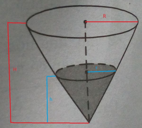 V=(1/3)*π*R^2*H=(1/3)*π*(3r/)^2*H=(1/3)*π*(9/4)r^2*H