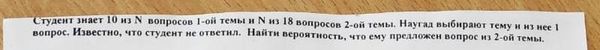 Студент знает 10 из № вопросов 1-ой темы и М№ из 18 вопросов 2-ой темы. Наугад выбирают тему м нзнест вопрос. Известно, что студент не ответил..`Найти вероятность, что ему предложен вопрос н 2 ой оан |