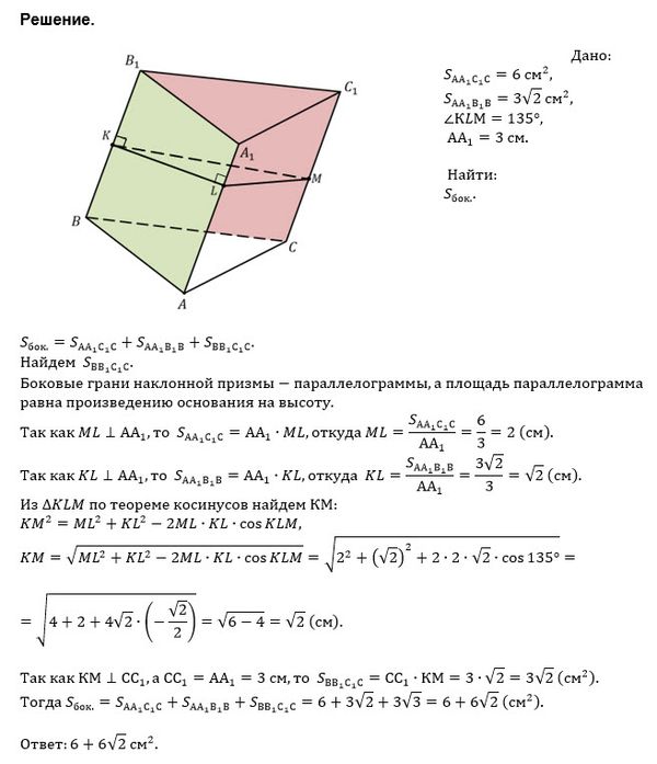 В наклонной треугольной призме площади двух боковых граней равны 6 см^2 и 3 корень 2 см^2. Угол между ними равен 135 градусов. Найдите площадь боковой поверхности призмы, если длина бокового ребра равна 3 см.