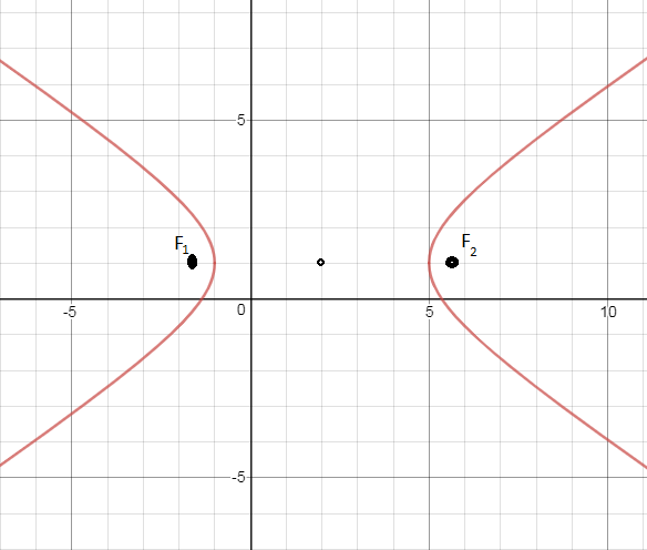(x-2)^2/9 - (y-1)^2/4 = 1 - уравнение гиперболы, с центром в (2;1)