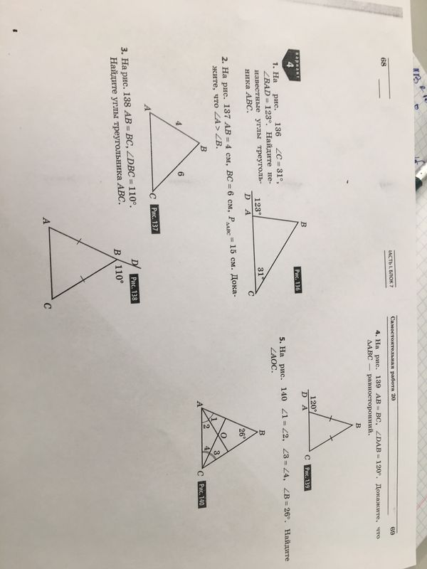 Решить надо 2,3,4. 2. На рис. 137 АВ = 4 см, ВС = 6 см. РАВС = 15 см. Докажите, что ΔАВС — равнобедренный. 3. На рис. 138 _ю = ВС, DВС=110°. Найдите углы треугольника АВС. 4. На рис. 139 АВ = ВС, С = 120°. Докажите, что ΔАВС — равносторонний.