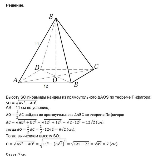 сторона основания правильной четырехугольной пирамиды равна 12 см, а боковое ребро 11 см. найти высоту пирамиды