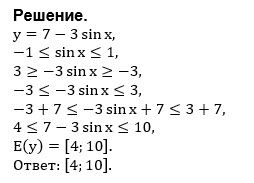 -1 ≤ sinx ≤ 1 -1 ≤ -sinx ≤ 1 -3 ≤ -3sinx ≤ 3 -3+7 ≤ 7-3sinx ≤ 7+3 4 ≤ 7-3sinx ≤ 10 О т в е т. [4;10]