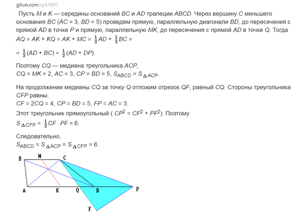 6. (20 баллов) В трапеции диагонали равны 3 и 5, а отрезок, соединяющий середины оснований равен 2. Найти площадь трапеции.