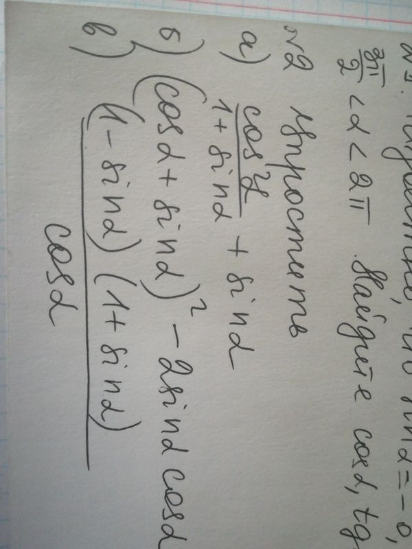 cos^2a = 1-sin^2a (1-sin^2a)/(1+sina) + sina = (1-sin^2a+sina+sin^2a) / (1+sina) = (1-sina)/(1+sina)