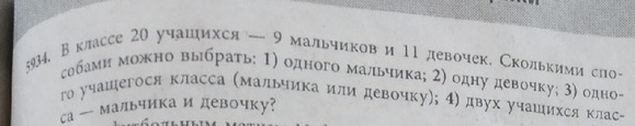В классе 20 учащихся — 9 мальчиков и 11 девочек. Сколькими спо- собами можно выбрать: 1) одного мальчика; 2) одну девочку; 3) одно го учащегося класса (мальчика или девочку); 4) двух учащихся клас са — мальчика и девочку?