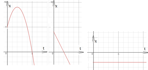 Начертите график зависимости от времени координаты, скорости и ускорения движения, заданного уравнением x=5+4t-t^2