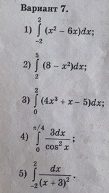 Вариант 7. 1) ∫ from -2 to 2 (x² - 6x) dx; 2) ∫ from 2 to 5 (8 - x²) dx; 3) ∫ from 0 to 2 (4x³ + x - 5) dx; 4) ∫ from 0 to π/4 (3dx / cos² x); 5) ∫ from -2 to 2 (dx / (x + 3)²).
