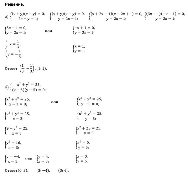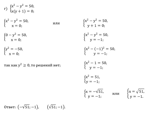 Решите систему уравнений: а) (x+y)(x-y)=0; 2x-y=1; б) x^2+y^2=25; (x-3)(y-5)=0; в) (x^2+y^2)=100; (x-7y)(x+7y)=0; г) x^2-y^2=50; x(y+1)=0