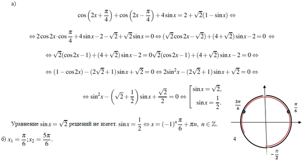 а) Решите уравнение cos(2x+Pi/4) + cos(2x-Pi/4) + 4sinx = 2 + sqrt(2)(1-sinx) б) Найдите все корни на промежутке [-Pi/2; 4]