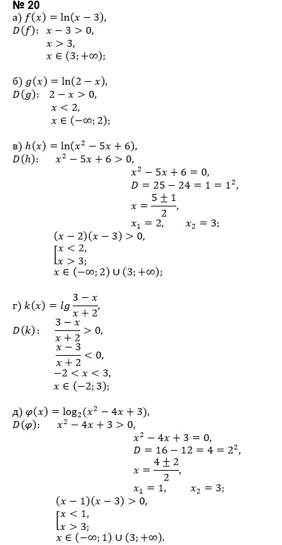 Найти область определения функции а) f(x)=ln(x-3) б) g(x)=ln(2-x) в) h(x)=ln(x^2-5x+6) г) k(x)=lg (3-x)/(x+2) д) ψ(x)=log2(x^2-4x+3)