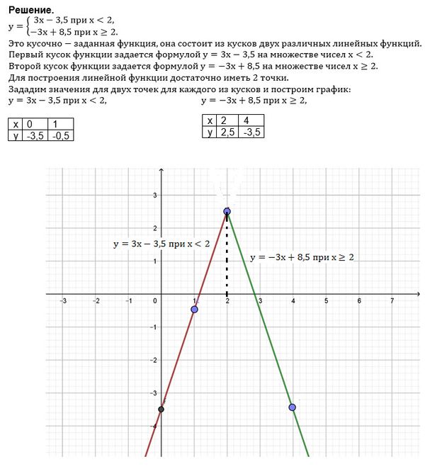 На (- ∞ ;2) строим прямую y=3x-3,5 по двум точкам (0;-3,5); (1;-0,5) На [2;+ ∞) cтроим прямую y=-3x+8,5 по двум точкам (2;2,5);(4;-3,5)
