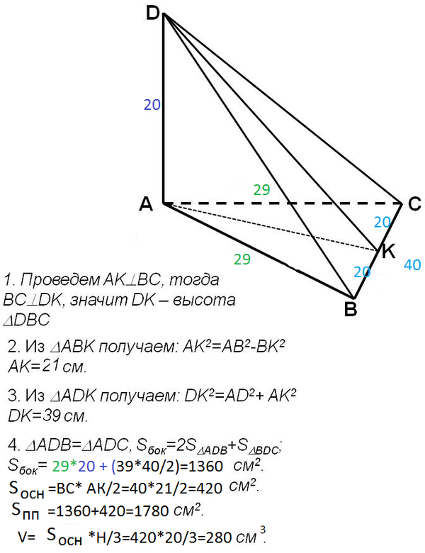 Задание№4 В пирамиде DABC ребро DA перпендикулярно плоскости основания–треугольника ABC.DA=20 см, AB=AC=29 см, BC=40см. Найти объем и площадь полной поверхности пирамиды.