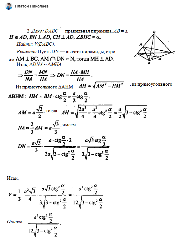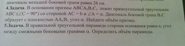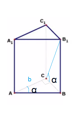 1. Из прямоугольного треугольника АВС BC=btg α Из прямоугольного треугольника ВВ_(1)С Н=BB_(1)=BC*tg α =btg^2 α V=S_(осн)*Н=(1/2)*АС*ВС*ВВ_(1)=(1/2)*b*btg α *b*tg^2 α = = [b](1/2)b^2*tg^3 α [/b] 2. Есть готовое решение: