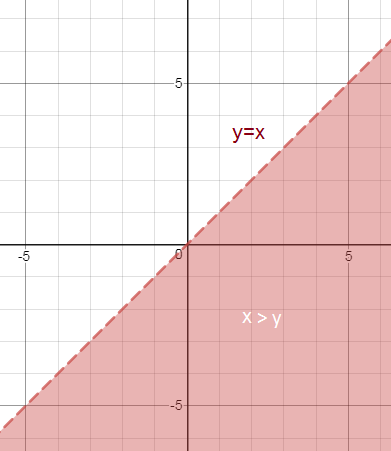 См. рис.1 Область x > y закрашена красным цветом. Прямая нарисована пунктиром, так как неравенство нестрогое.