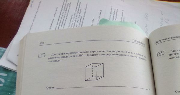 7. Два ребра прямоугольного параллелепипеда равны 8 и 5, а объем параллелепипеда равен 280. Найдите площадь поверхности этого параллелепипеда.