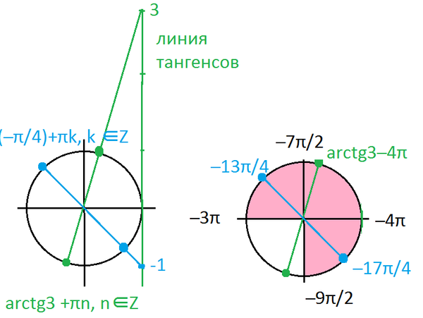 [b]x=(-π/4)+πk, k ∈ Z[/b] или [b]x=arctg3 +πn, n ∈ Z[/b]