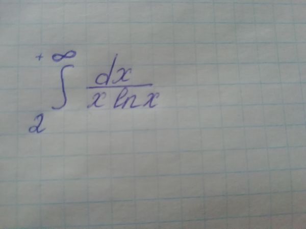 Табличный интеграл: ∫ du/u=ln|u|+C u=lnx du=(lnx)`dx du=dx/x ∫ ^(+ ∞)_(2)dx/(x*lnx)= ∫∫ ^(+ ∞)_(2)d(lnx)/lnx=ln|lnx||^(+ ∞ )_(2) Расходится, так как ln|ln(x ))→+∞ при х →+∞